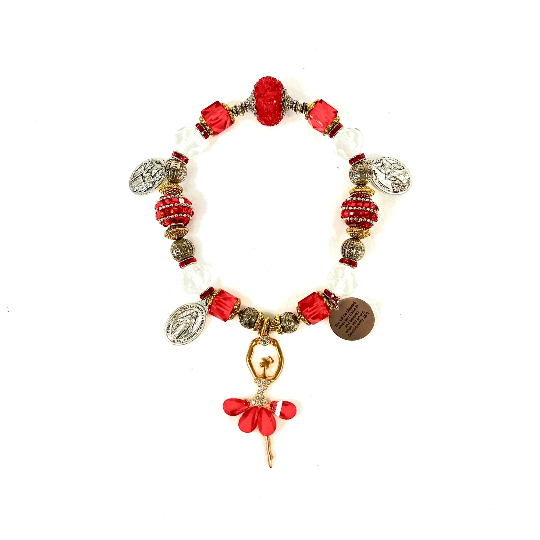 Discover the exquisite Red & Gold Ballerina door blessing, intricately designed with elements of faith and Catholic medals, featuring St. Agnes, the patron saint of dancers. This piece features stunning red and crystal accents, beautifully complemented by the elegant red crystal and gold ballerina. Elevate your space with this symbol of grace and spirituality.