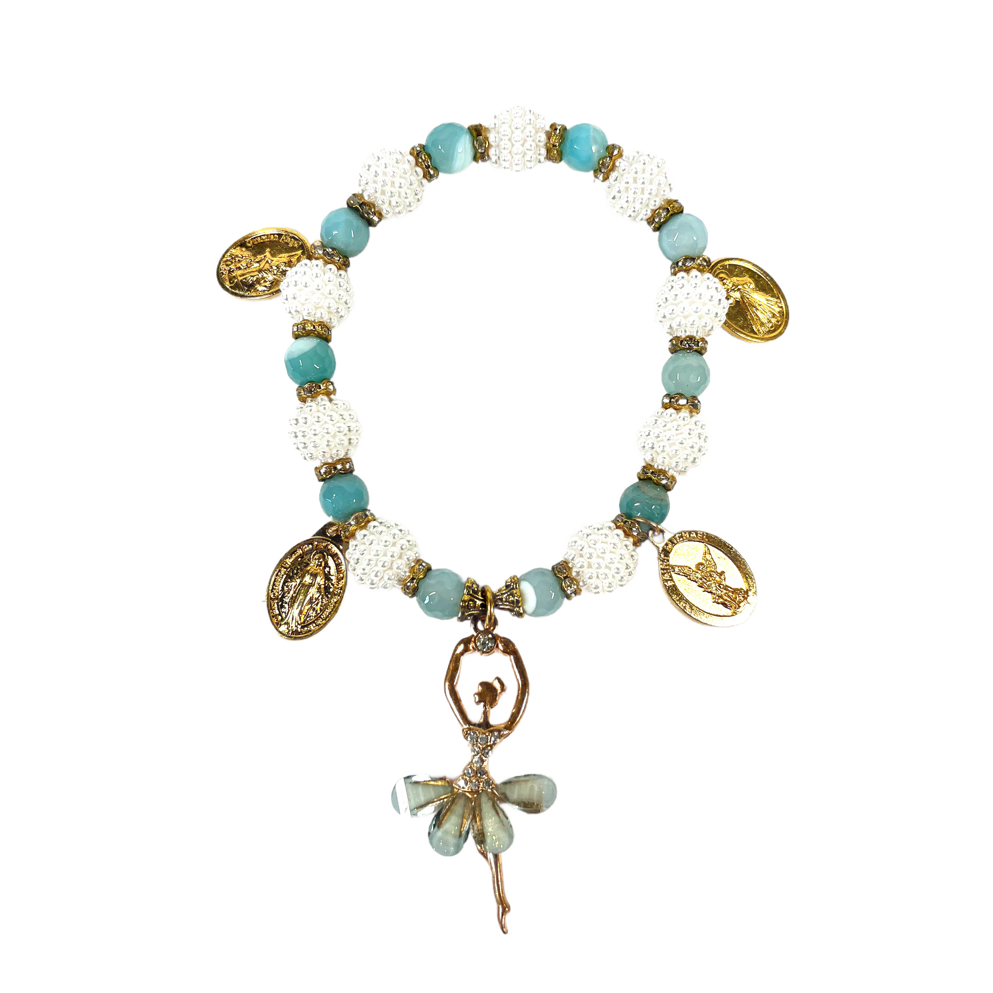 Discover the exquisite Teal & Silver Ballerina door blessing, intricately designed with elements of faith and Catholic medals, featuring St. Agnes, the patron saint of dancers. This piece features stunning teal and clear crystal accents, beautifully complemented by the elegant teal crystal and silver ballerina. Elevate your space with this symbol of grace and spirituality.