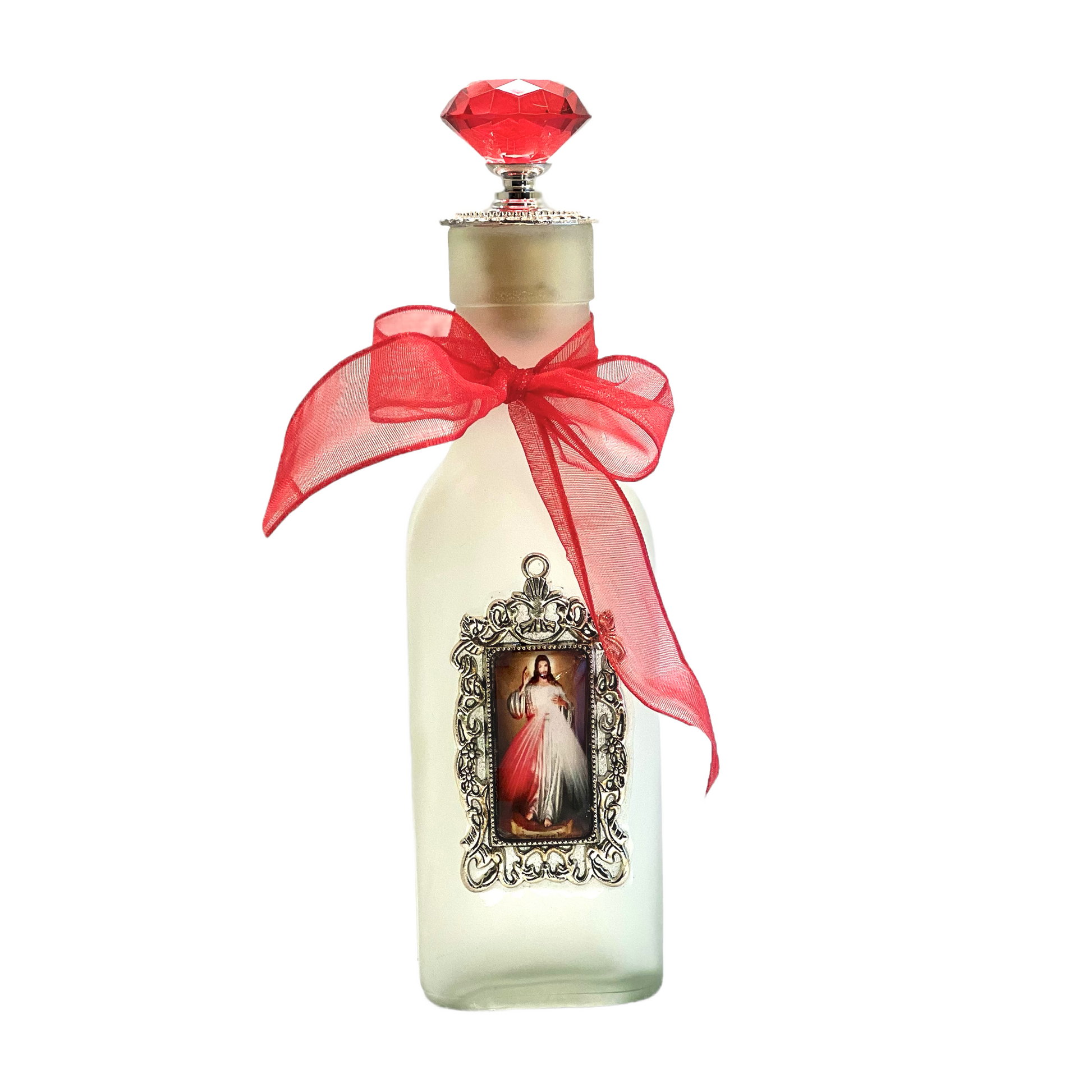 Elevate your sacred space with our Frosted Glass Holy Water Bottle featuring the Divine Mercy image. Perfect for storing holy water, this bottle combine a frosted glass design with holy significance. Add a touch of reverence to your rituals with these exquisite bottles.