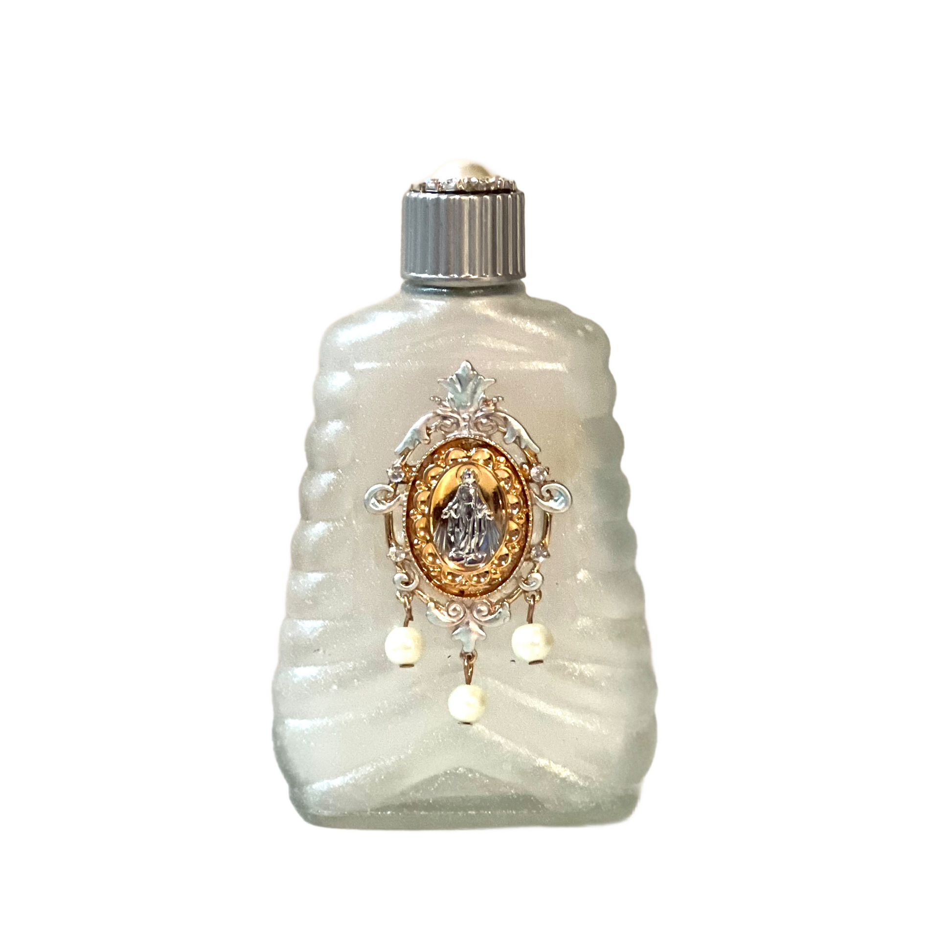 This Miraculous Medal Holy Water Bottle features a refined silver over rose gold medal, elegantly accented with a silver and white frame. This vintage-inspired bottle showcases a pearlescent frost finish, complemented by delicate dangling pearls that enhance its timeless appeal. Perfect for those seeking a sacred keepsake with expert craftsmanship and subtle sophistication.