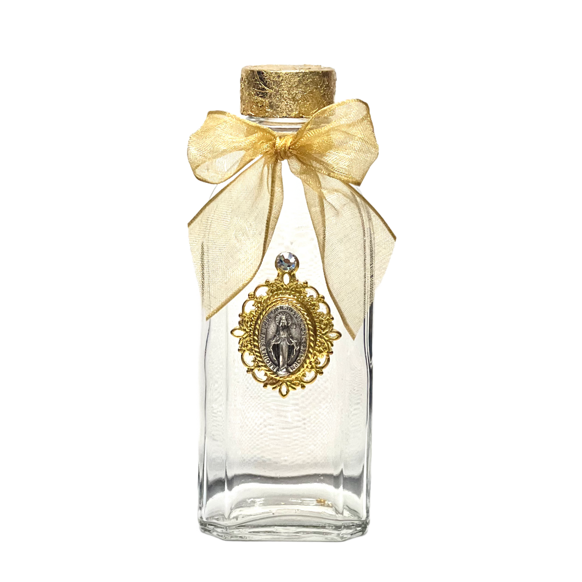 Carry the blessings of holy water in a beautifully designed vintage glass bottle adorned with a Miraculous Medal in silver over gold. The gold leaf cap adds a touch of sophistication, making it a cherished devotional item for personal prayer or as a meaningful Catholic gift. Compact and portable, this small holy water bottle is perfect for home, travel, or gifting with grace.