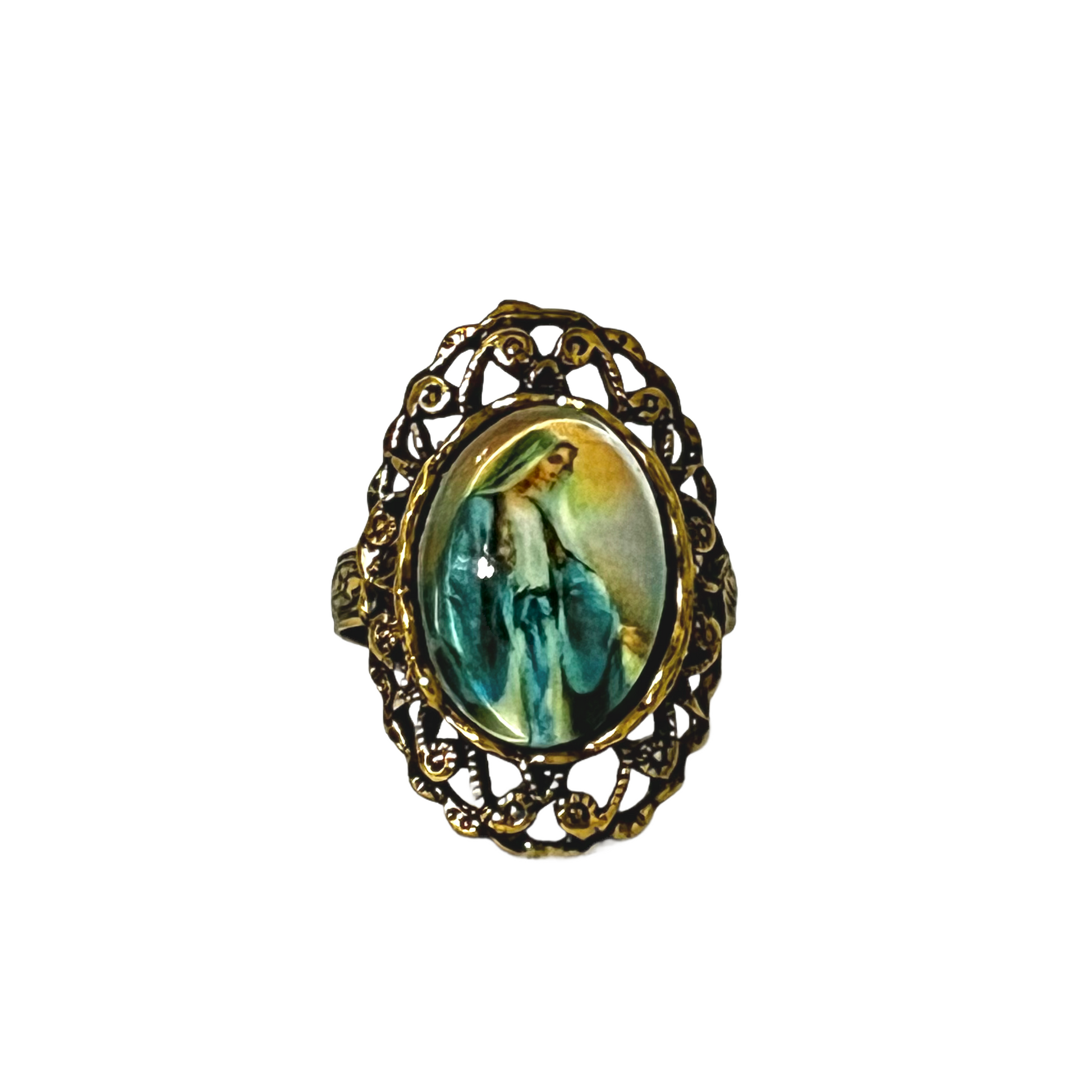 Embrace your faith with elegance and style with the Our Lady of Grace Ring in a stunning gold finish. This exquisite oval ring beautifully captures the essence of devotion to Our Lady of Grace, making it a perfect symbol of faith and grace.