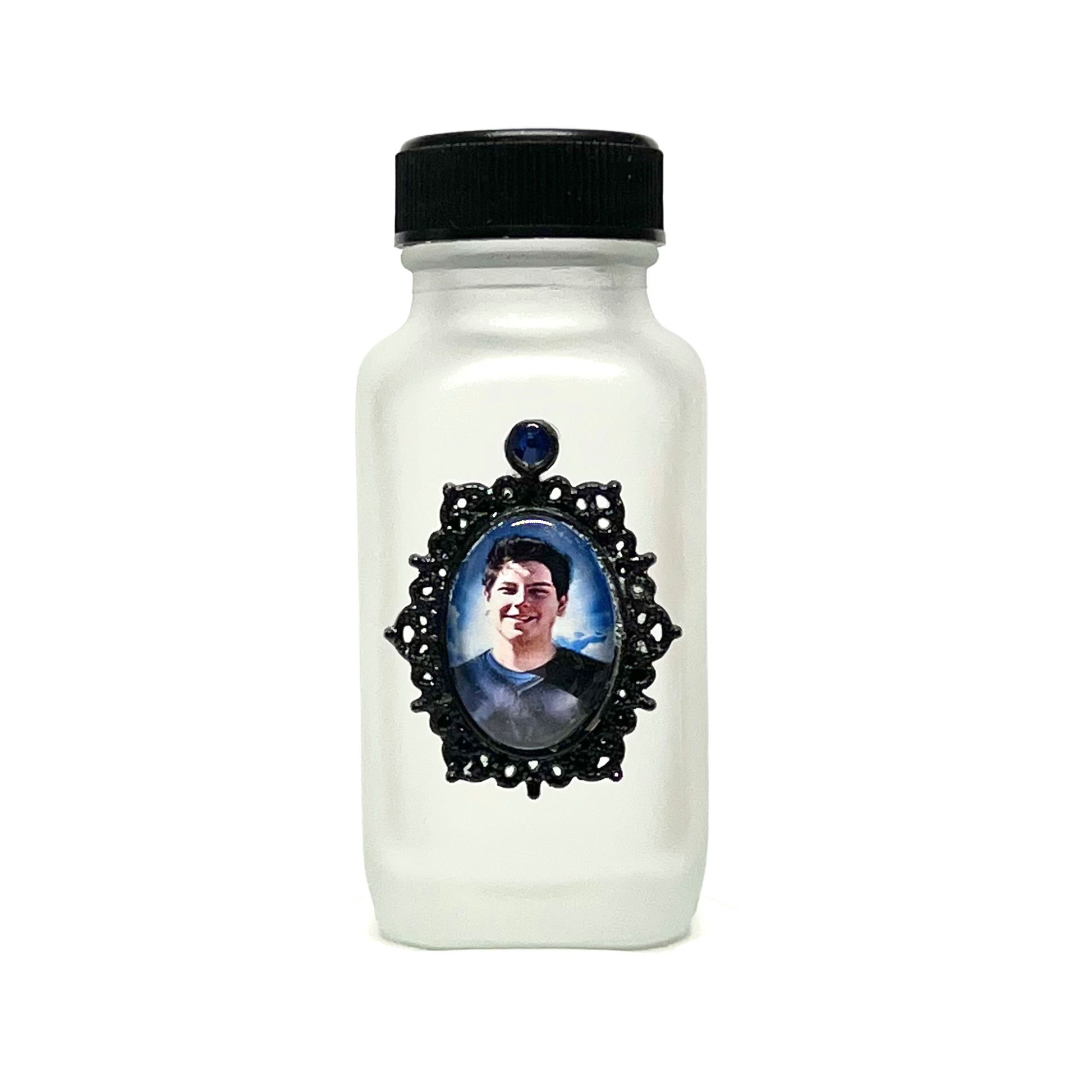 This elegant Saint Carlo Acutis Holy Water Bottle features a frosted glass body paired with a sleek black screw cap, blending timeless Catholic tradition with refined design. Its compact size makes it perfect for personal devotion, allowing you to carry holy water with grace and reverence wherever you go. Crafted to honor faith and daily spirituality, it serves as a discreet yet meaningful accessory for moments of prayer and blessing.